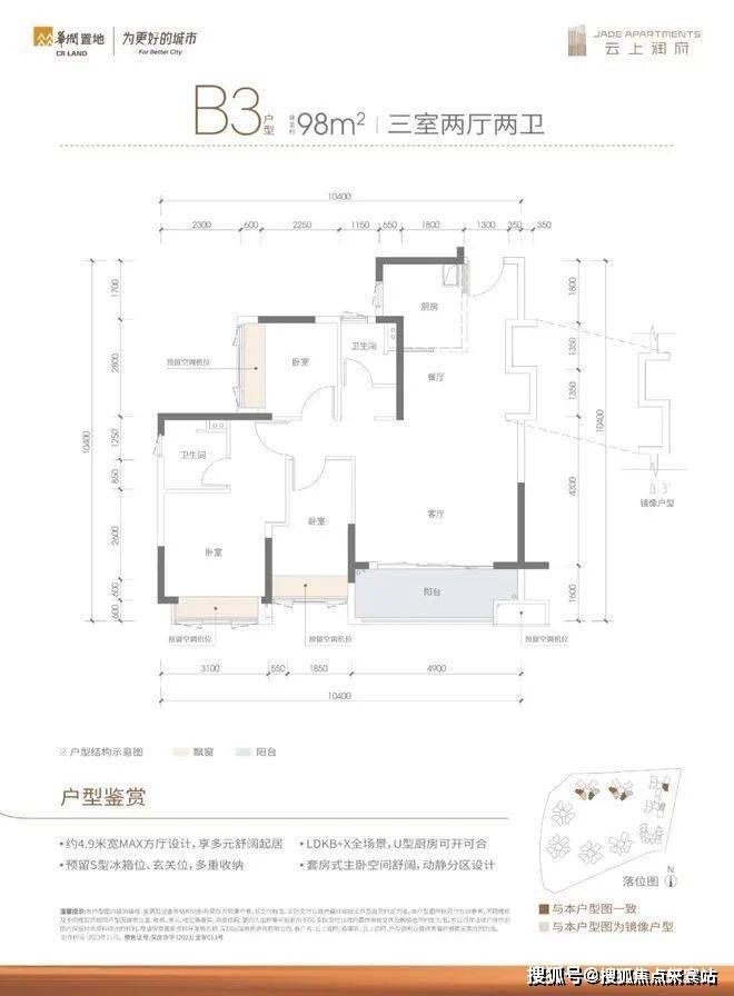 98㎡的3房2厅2卫,B3户型,设计的是MAX方厅,客厅4.9米开间,LDKB一体化+X全场景,S墙设计预留冰箱卡槽位,3个卧室分别做到了3.1米/2.8米/2.4米的宽度,U型厨房,公卫三段式分离设计,得房率83.95%(不含赠送),有西南或东南朝向。
