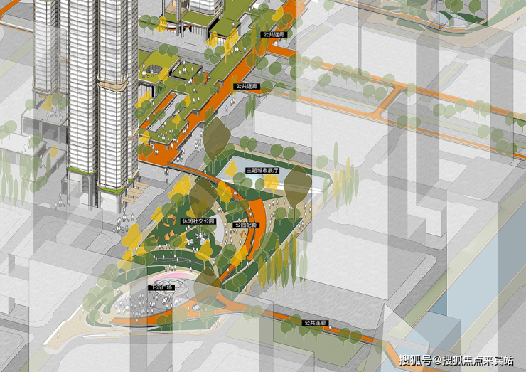 超高层项目常在底部设置简单底商,而本方案却创建了复合型立体底盘,整合商业与公园,通过步行系统实现连通。