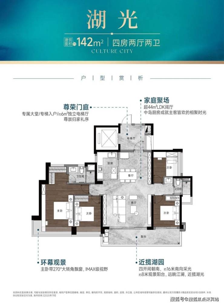 约142㎡户型开始其私密性就更高了,户内尺度更大之余,还拥有专梯入户和独属大堂配置,主卧升级至带270°大飘窗,仪式感真的向豪宅看齐。