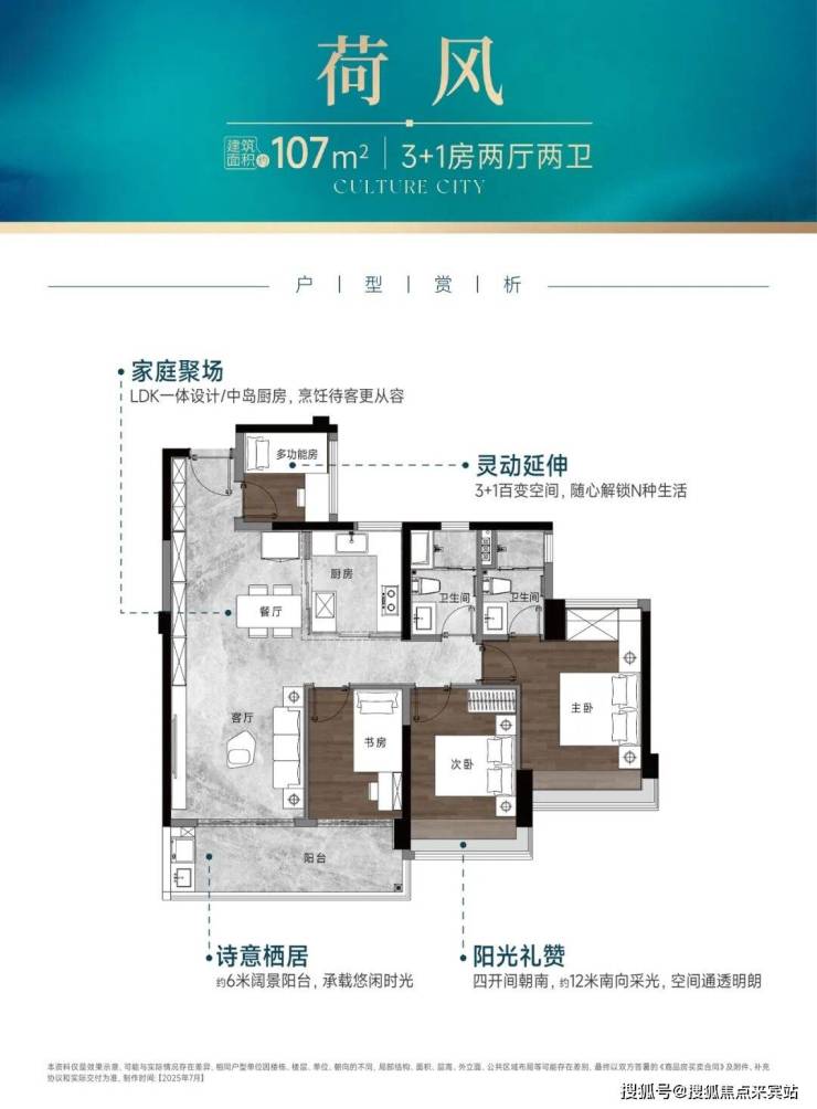 以建面约107㎡3+1房为例,该户型拥有约6米奢阔阳台,配合LDK一体化设计,整体呈现约12米南向采光面。