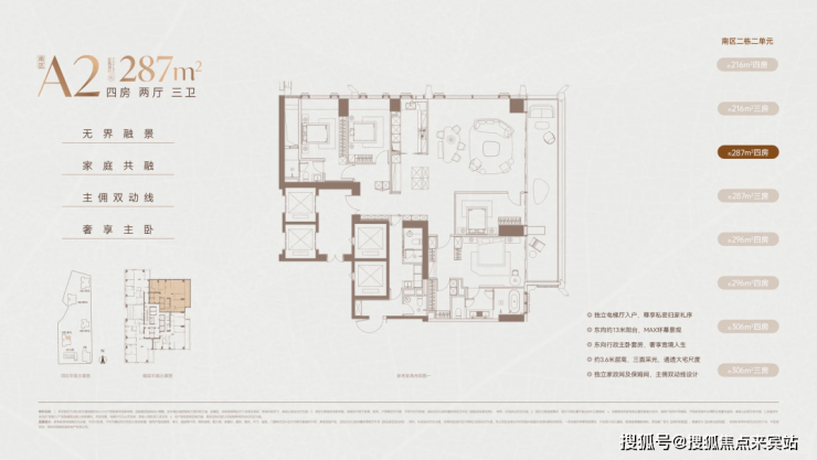 216㎡四房两厅三卫:入门顶豪,四房功能齐全,无保姆间,适合精英家庭;客厅 + 东向大阳台联动,阳台进深约 2.4 米;92%+ 实用率,框架核心筒无次梁,可微调布局。