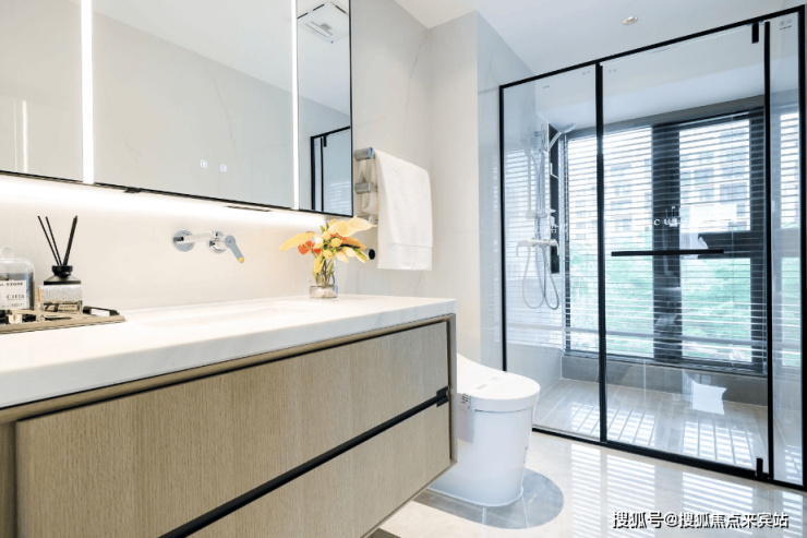 卫浴空间也因窗景而明亮惬意,干湿分离的设计,方便清扫也更为安全。
