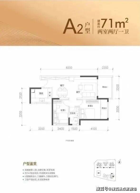 71㎡的2房2厅1卫,设计的是竖厅格局,客厅3.2米开间,进深8.2米,LDKB一体化设计,2个卧室分别做到了主卧12.5㎡/次卧9.12㎡(包含墙体飘窗),U型厨房,卫生间干湿分离,得房率约88%(包含赠送),东南朝向.