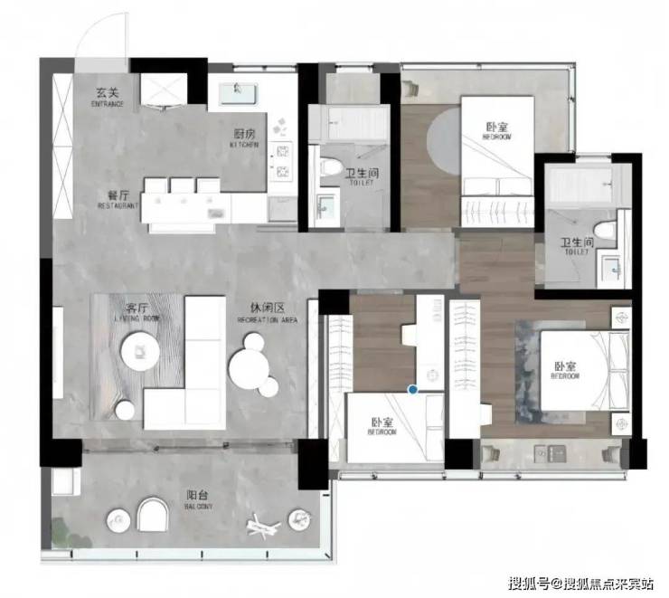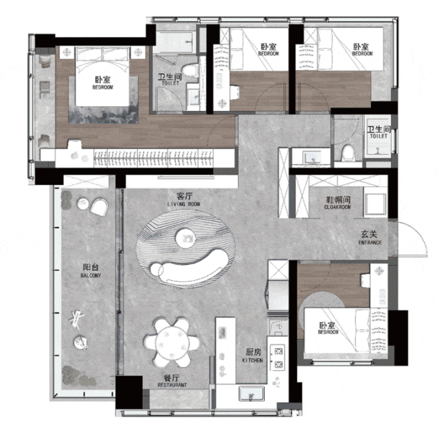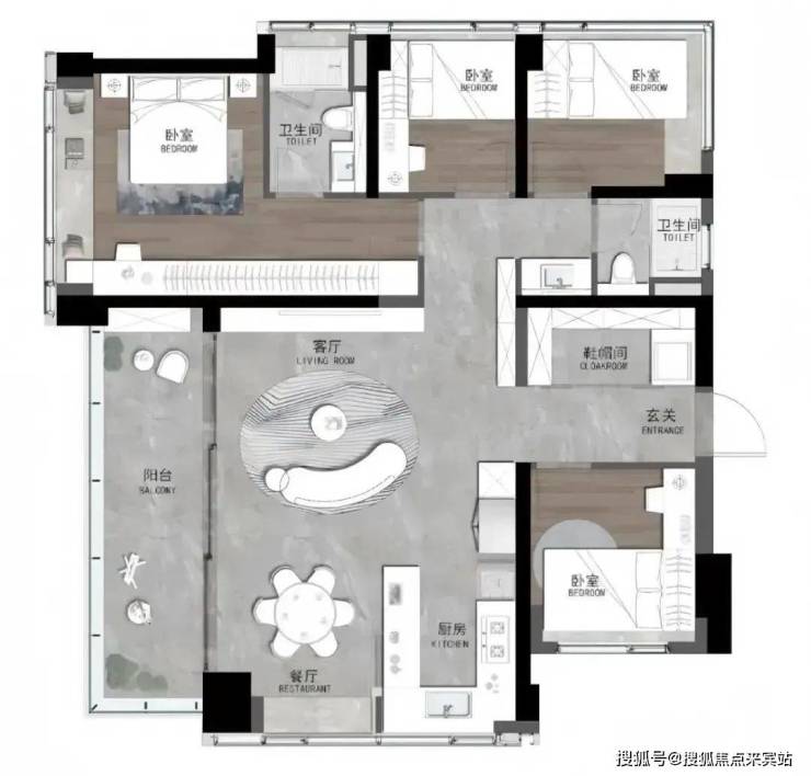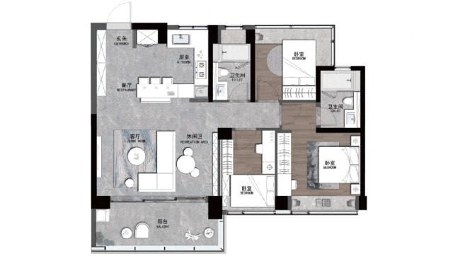 该户型最大的亮点在于减少了室内承重墙,让整个空间自由性和可改造性更强。