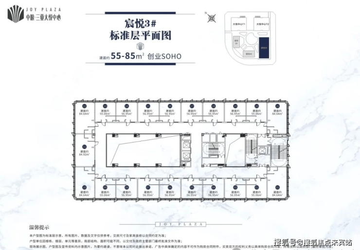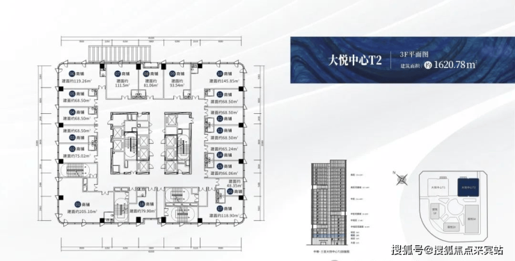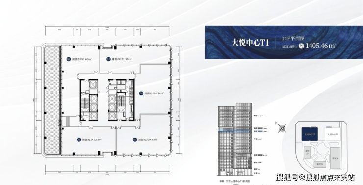 大悦中心——T3(100米写字楼)共21层,总建面约2.4万㎡,约12米建筑层高大堂,标准层高约4.2米,标准层(13-21F)建面约为1525.47㎡,分户建面约284-333㎡。