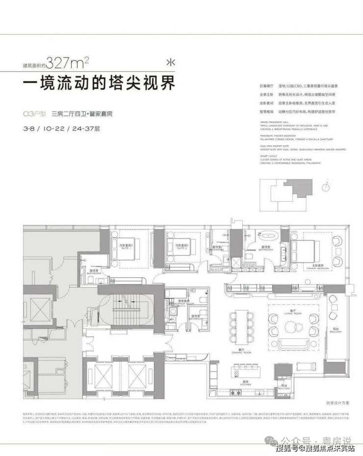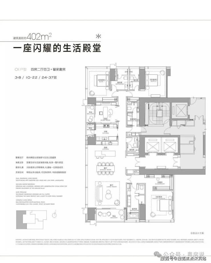 3栋低区3-37F,三面采光,客厅及主卧朝南看海,除了书房其它卧室全套房设计,该有的功能和尺度都给到了。缺点的话就是主卧整体尺度偏局促了一点。