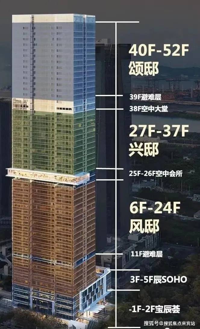 项目总高230米,共52层,6层起卖,11、39F为避难层,25-26F为空中会所,28F为空中大堂。