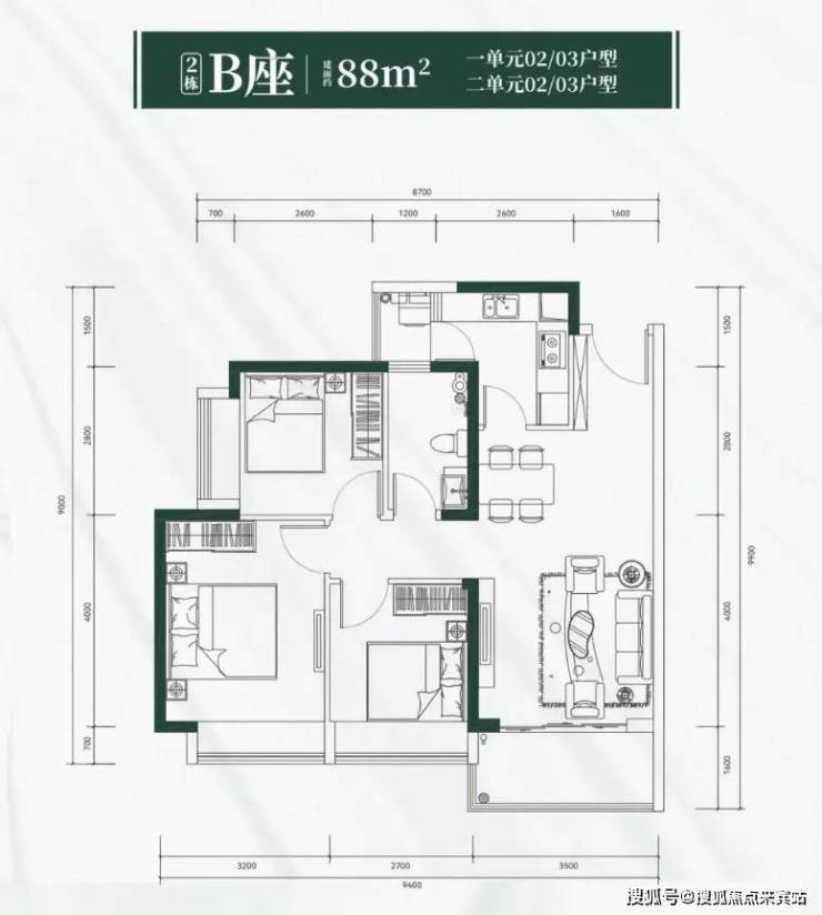 2栋B座一单元02、03户型、2栋B座二单元02、03户型:面积约为88㎡的3房2厅1卫