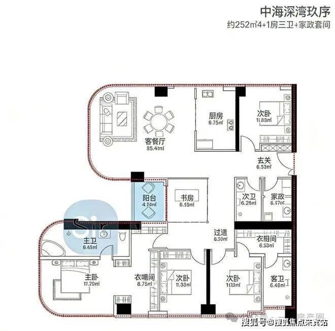 对比中海深湾玖序(这里简称一期)252㎡户型,二期的产品升级堪称肉眼可见。得益于新规红利,得房率明显提升(一期仅75%)。飘窗实现全赠送,这是一期完全没有的配置。更值得一提的是,新增了一个超大景观阳台,而非一期仅有的单个小阳台,采光、视野和实用空间都拉满了,能清晰感受到深圳顶豪户型的迭代诚意。