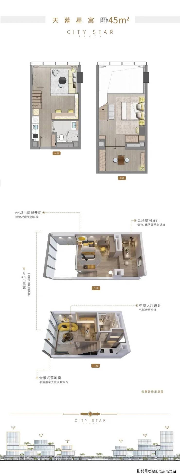 【约45㎡天幕星寓】:约4.2米阔尺开间金领小户型,低门槛轻松买入地铁上盖物业,约4.5米挑高双层享受,双层动静分区,宜商宜租。