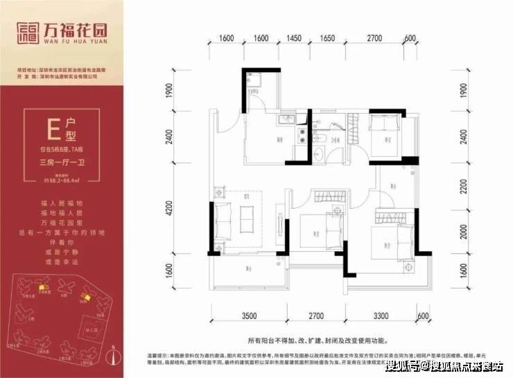 万福花园,总占地面积约3.5万㎡,总建筑面积约22万㎡,计容建筑面积15.7万㎡,容积率4.32,绿化率40%,共由7栋10座总高32-33层的住宅组成,其中1/2/6/7栋住宅33F,3/5栋住宅32F,另外规划有1所幼儿园,打造有1.8万㎡园林,超大楼间距花园空间。