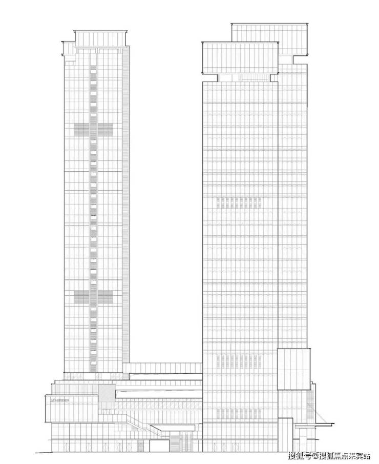 酒店位于主次干道交汇处,形象突出。公寓南向面宽充足,塔楼错动布局减少对视。酒店大堂及公区抬升设计,既优化公寓与客房视野,又释放地面空间,形成L型商业动线连接社区,打造双首层开放街区。商业借抬升体量增强气势,各功能相辅相成。