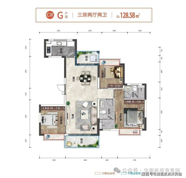 🏖G户型约128.58㎡(三房两厅两卫)