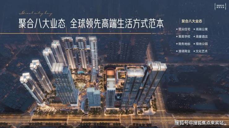 在环湾顶点之上高度聚合塔尖住宅、高端公寓、菁英学校、隐奢酒店、商务地标、绿地公园、漫调商业、文化艺术八大业态于一体,探索环湾都心、复合城市的未来生活巅峰实践。