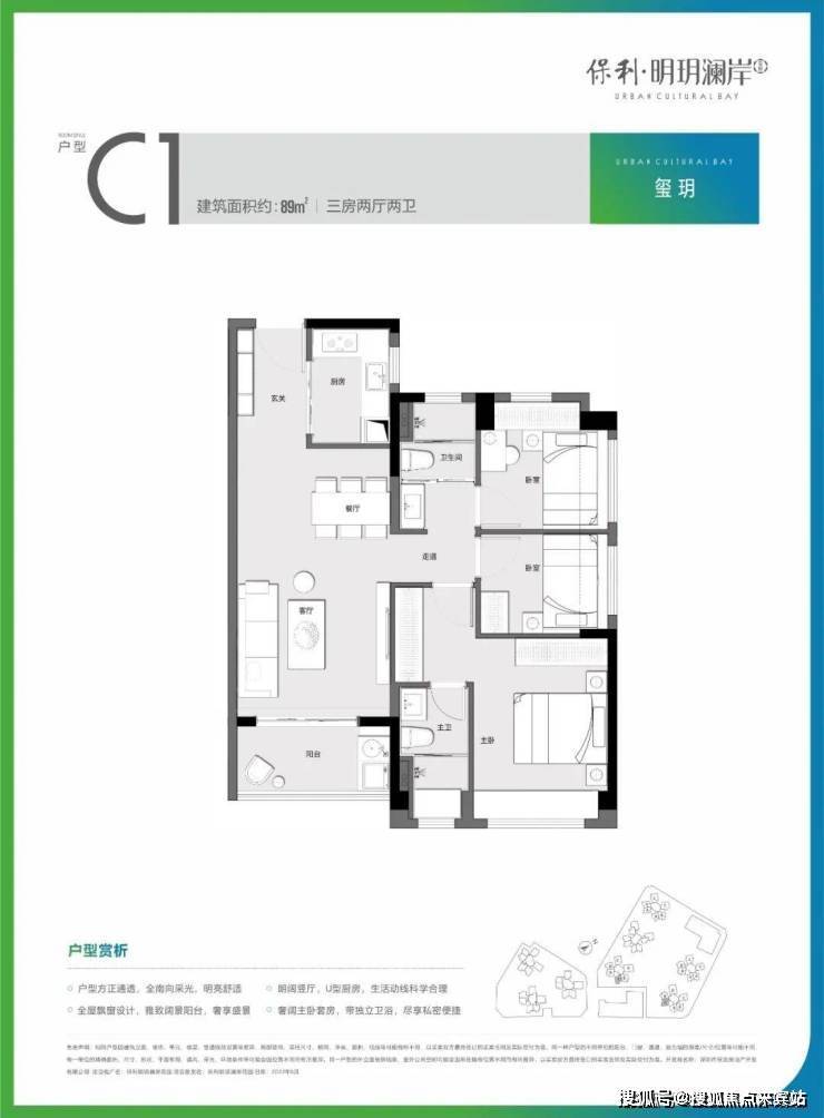 89㎡的3房2厅2卫,设计的是竖厅格局,客厅3.5米开间,LDKB一体化设计,进门独户玄关,动静分区,主卧大套间,U型厨房,公卫三段式分离设计,得房率:75.6%(不含赠送),阳台有西南向、东南朝向或朝正南向。