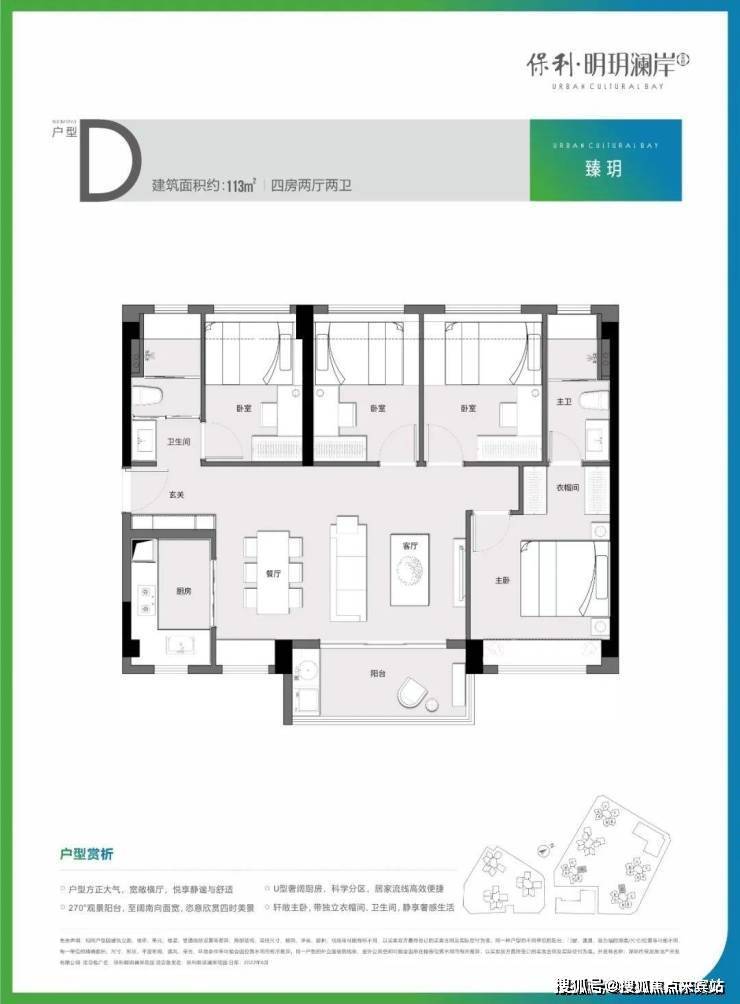 113㎡的4房2厅2卫,设计的是横厅南北通透格局,客餐厅6米开间,进门独户玄关,主卧大套间,U型厨房,公卫三段式分离设计,得房率:77.57%(不含赠送),阳台主朝西南向、东南向或正南向。