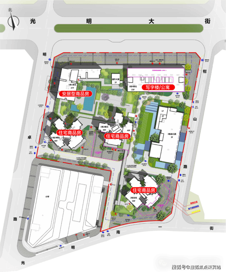 教育方面:项目自身配建有一所12班幼儿园,项目西南侧建设有一所18班小学。参照光明区教育局2020年秋季的学区划分判断,目前项目地块小学学区为:东周小学、中山大学附属学校小学部、楼村小学、教科院实验学校(光明);初中学区为光明中学、深圳实验光明学校、光明区高级中学、中山大学附属学校初中部。