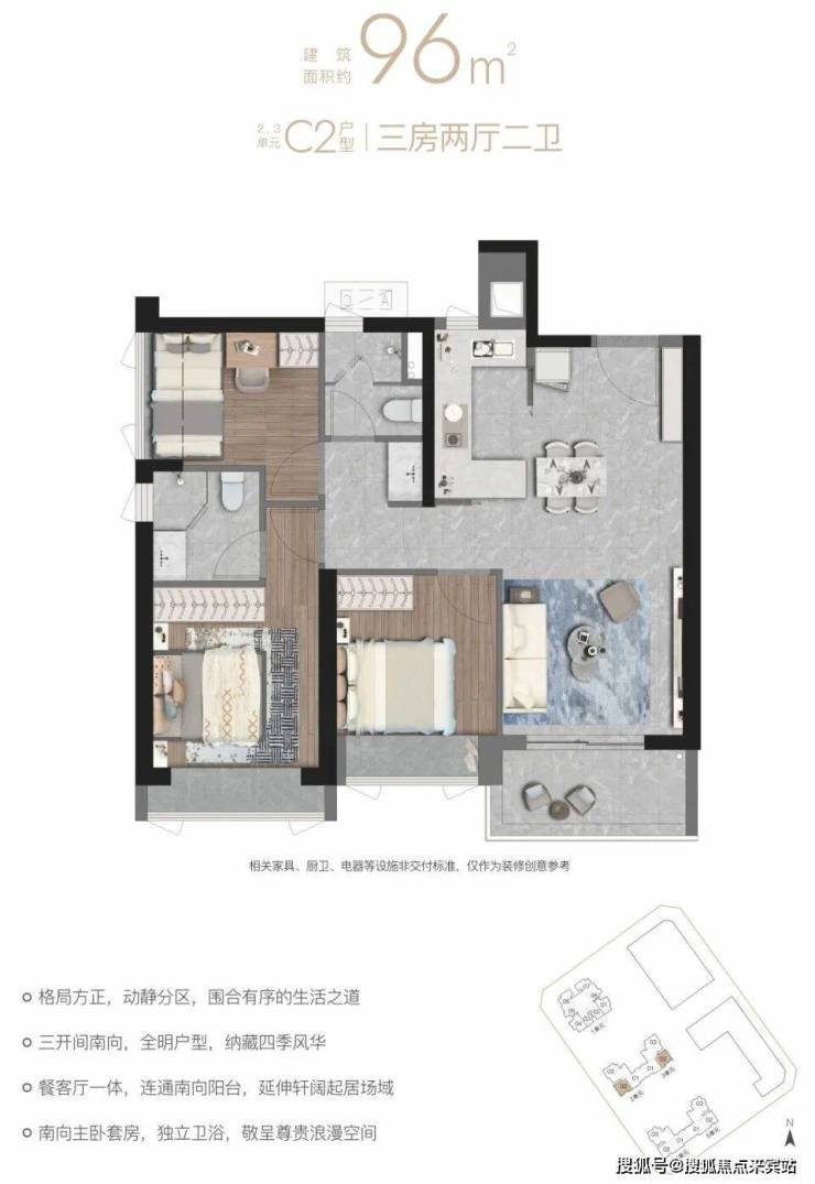 96㎡的3房2厅2卫,C2户型,5栋4/5单元02户型,设计的是竖厅格局,进门入户玄关,客厅3.3米开间,餐客厅一体化设计,三开间朝南,动静分区,U型厨房,公卫三段式干湿分离,得房率约80%(包含赠送),东北或西南朝向。