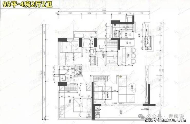 99㎡的4房2厅2卫,设计的是竖厅格局,客厅3.35米开间,LDKB一体化,S墙设计预留双开门冰箱卡槽位,三开间朝南,动静分区,分别做到了主卧15.26㎡/次卧9.57㎡/次卧6.96m²/次卧6.96㎡(包含墙体飘窗),U型厨房,公卫三段式干湿分离,赠送设备平台,得房率约78.27%(不含赠送),客厅连接次卧出9.37m²大阳台西南或东南朝向。靓点:99平做到了4房2卫,主卧270°无柱转角飘窗,厨房烟道外置+额外赠送设备平台,并且是纯南向格局。