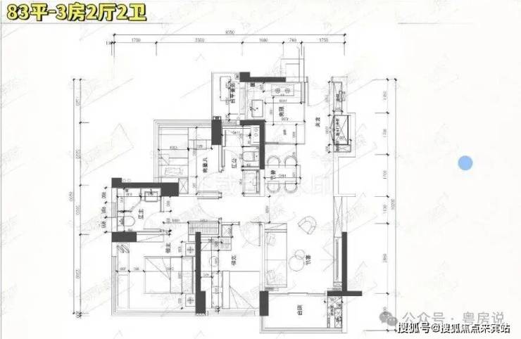83㎡的3房2厅2卫,设计的是经典竖厅格局,客厅3.35米开间,LDKB一体化,S墙设计预留双开门冰箱卡槽位,三开间朝南,动静分区,分别做到了主卧16.02㎡/次卧9.08㎡/次卧7.01㎡(包含墙体飘窗),U型厨房,公卫三段式干湿分离,赠送1.98平设备平台,得房率约77.15%(不含赠送),阳台5.02m²西南或东南朝向。靓点:83平做到了3房2卫,主卧270°无柱转角飘窗,厨房烟道外置+额外赠送设备平台,并且是纯南向格局。