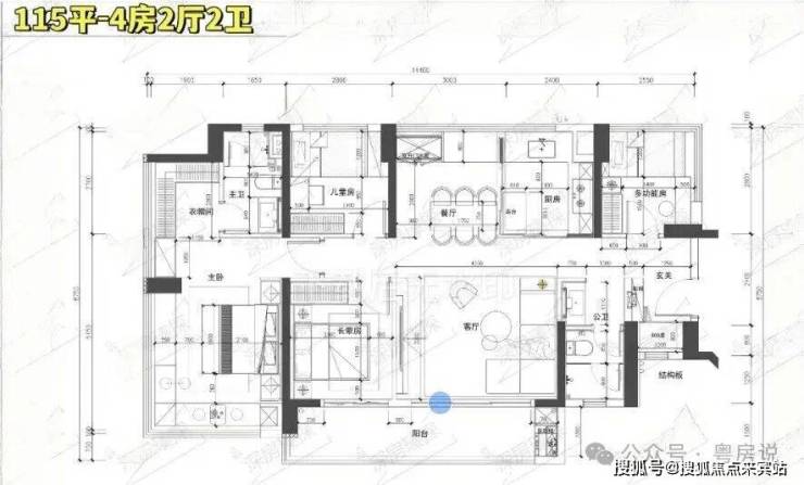115㎡的4房2厅2卫,设计的是竖厅南北通透格局,进门入户玄关,客厅4.45米开间,餐客厅分离设计,分别做到了主卧23.45㎡/次卧8.96㎡/次卧7.84㎡/次卧7.68㎡(实测面积),客厅连接次卧出10.87m²的观景大阳台,L型中式+岛台灵动式厨房,公卫三段式干湿分离,得房率约78.27%(不含赠送),阳台主朝东南或西南向。靓点:南北对流+7.25米长超大观景南向阳台,超大主卧+270°无柱转角飘窗+进门独立玄关800库。