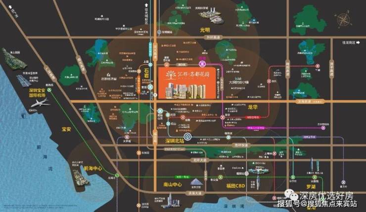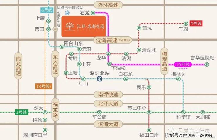 畅享龙大/南光/广深/沈海(机荷)高速,临近地铁6号线/13号线(在建中)/25号线(在建中),6条短线直达6大地铁站(龙胜、元芬、阳台山东地铁接驳已开通)、3条快线直达车公庙(已开通)/科技园(已开通)/大剧院等中心区
