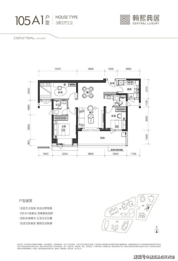 105㎡A1户型:位于三单元03梯腿,3房2卫、典型的双龙抱珠格局、入户带玄关,朝东向,阳台开间6.5米,客餐厅面积约23㎡,主卧套房约16㎡,主客卧分开私密性好。