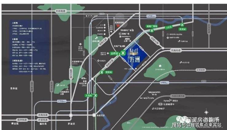 龙岗中心城,180万㎡建面滨水大盘:合正方洲区位优越:楼盘位处龙岗中心城板块,拥有龙岗最好的配套,住宅区距离3号线吉祥站800米,且挨着龙岗大道,沈海高速500米,无论自驾还是公共交通,通行全城便利;大社区,生态宜居:180万㎡建面大盘,融合产业、商业、居住、教育于一体,其中旗舰级商业携手华润万象生活打造,并与龙岗河生态碧道、人文休闲场景等公共场地充分融合,营造多元化的生活空间场景(龙岗河穿流而过,项目为深圳唯一的“一河两岸”亲水社区,享有近一公里的优质滨水生态资源)。
