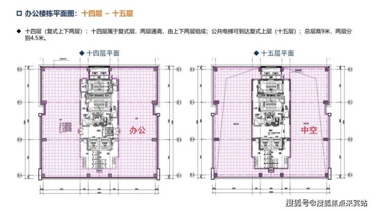 办公楼:层高约4.5米,两梯两户,单套270°三面采光环幕山海城港景观,14楼顶层复式,电梯可上15层。