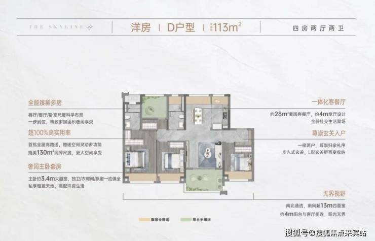 其中,约113㎡四房两厅两卫明星洋房,以媲美130㎡的奢阔尺度惊艳湾区——约28㎡IMAX宽厅连通景观阳台,超13米南向四面宽设计,南北通透,采光无界,让阳光与清风成为日常主角。