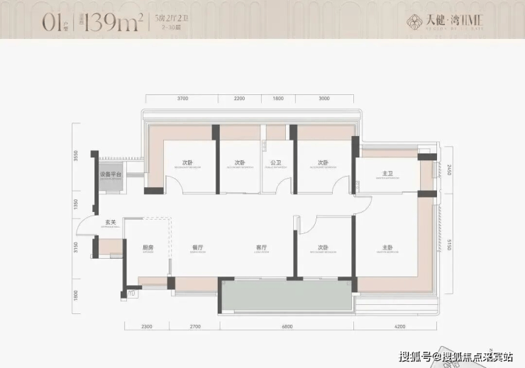 139㎡5房2卫,竖厅户型,朝南看海,户型结构和115接近,多了一间朝南卧室,主卫做了双面凸窗;