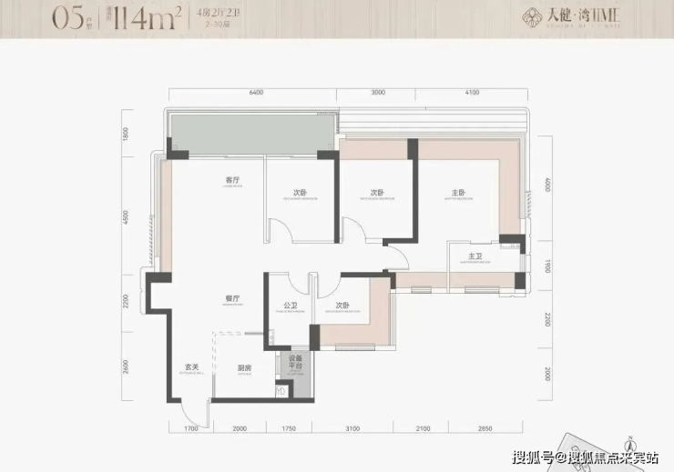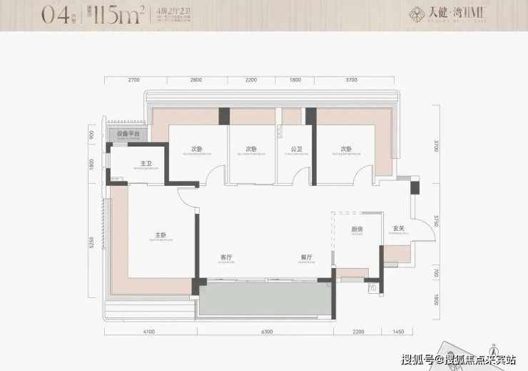115㎡4房2卫,横厅户型,朝南看海,入户独立玄关,但三个次卧朝北;