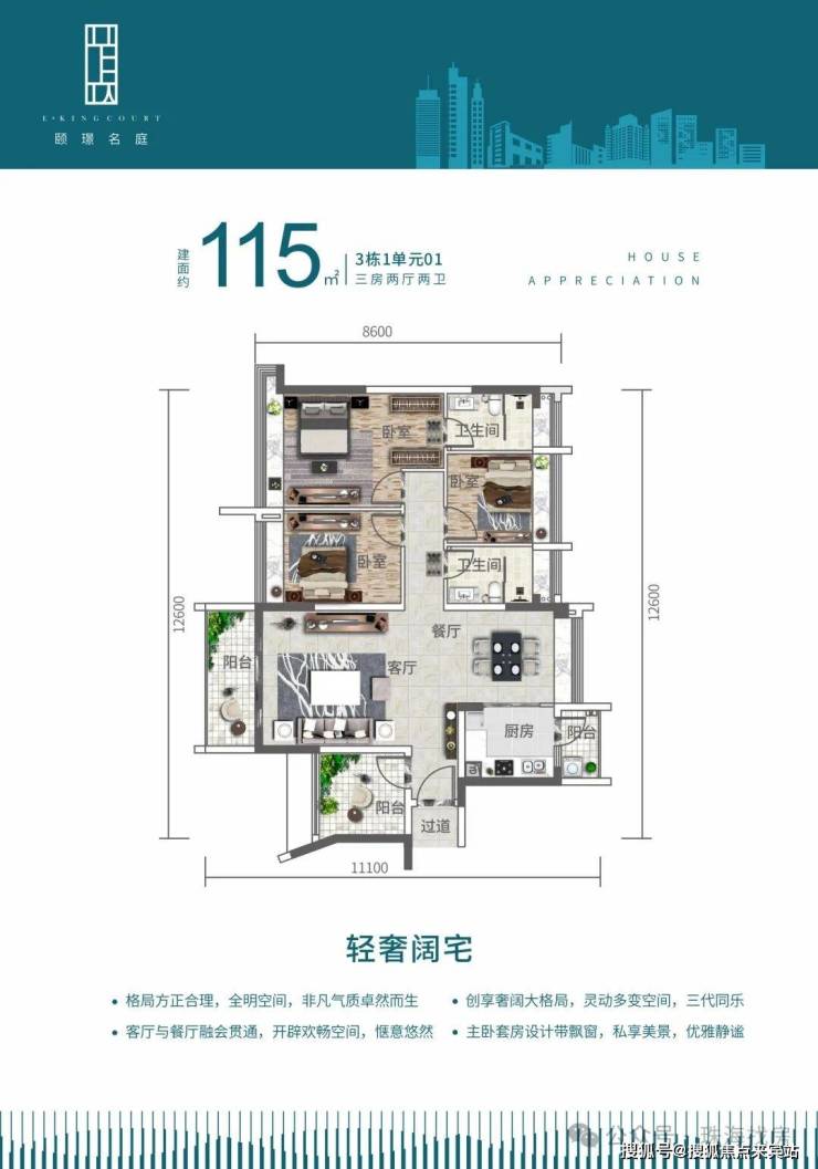 3栋1单元01户型,115平方3+1房两厅两卫