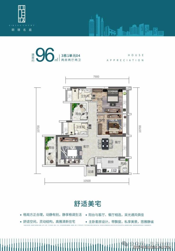 3栋1单元04户型,96平方2+1房两厅两卫
