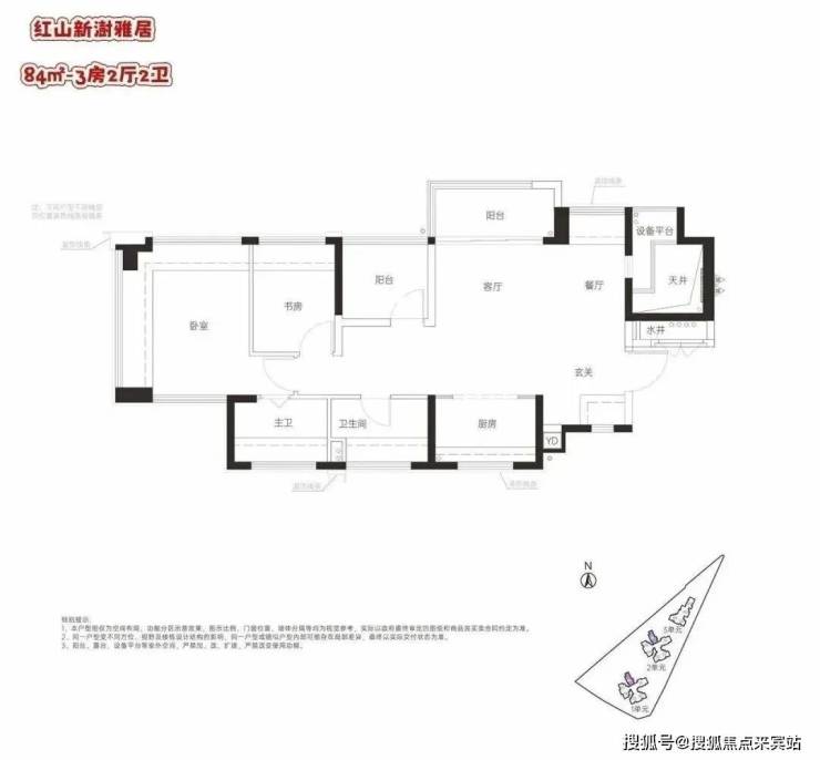 84㎡的3房2厅2卫,设计的是横厅南北通透格局,客厅3.4米开间,LDKG+X空间一体化,动静分区,主卧南北通设计,餐厅位带1个设备平台,U型厨房,卫生间干湿分离,得房率:100.1%(包含赠送),阳台东北朝向。