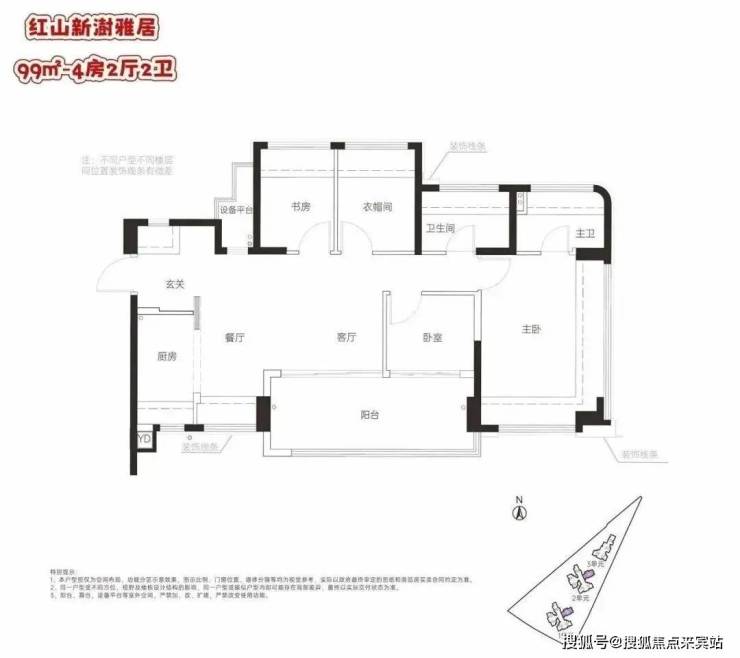 99㎡的4房2厅2卫,设计的是横厅南北通透格局,客餐厅5.35米开间,LDKG+X空间一体化,进门独立入户玄关,五开间朝南,主卧大套间设计,餐厅位带1个设备平台,U型厨房,卫生间干湿分离,得房率:100.1%(包含赠送),阳台东南朝向。