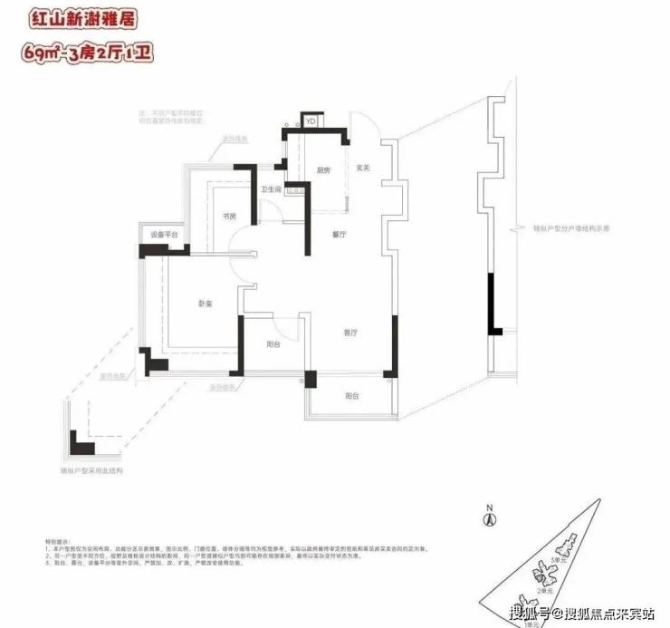 69㎡的3房2厅1卫,设计的是竖厅格局,客厅3米开间,LDKG+X空间一体化,S墙设计预留冰箱卡槽位,动静分区,三开间朝南,主卧+1个次卧都是双飘窗设计,次卧带1个设备平台放空调机位,U型厨房,卫生间三段式干湿分离,得房率:100.1%(包含赠送),西南朝向。