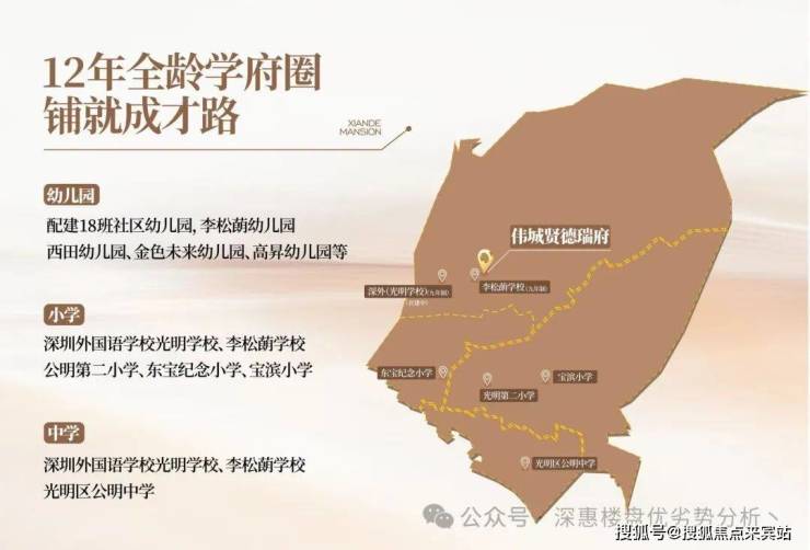 教育配套:幼儿园:配建18班社区幼儿园,李松蓢幼儿园、西田幼儿园、下村幼儿园、金色未来幼儿园、高昇幼儿园等,小学:李松蓢学校、深圳外国语学校光明学校、公明第一小学、公明第二小学、马田小学等。中学:李松蓢学校、深圳外国语学校光明学校、深圳市公明中学、深圳市光明高级中学、深圳外国语学校高中园光明高中园等