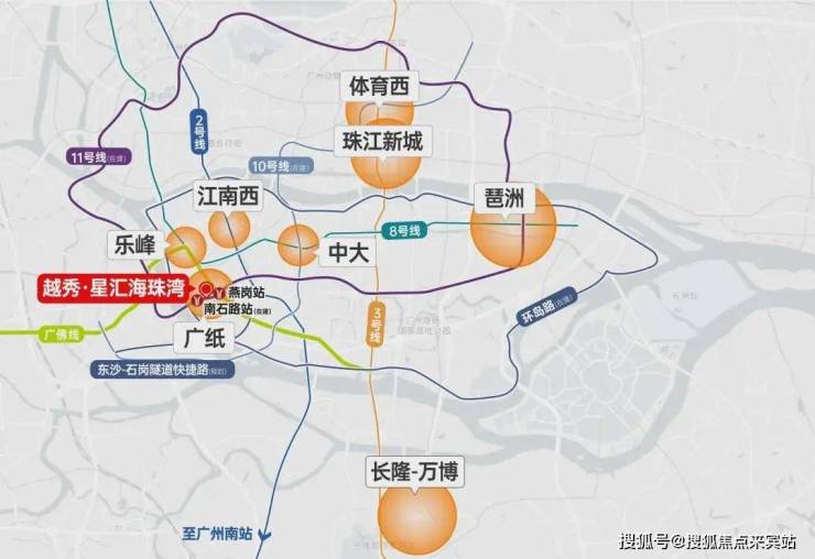 广佛线燕岗站,接驳广佛百万客流;环城线11号线(在建中)横跨海珠、天河、越秀、白云和荔湾五大主城区,连接广州火车站、广州东站等大型交通枢纽,发展价值无可限量。