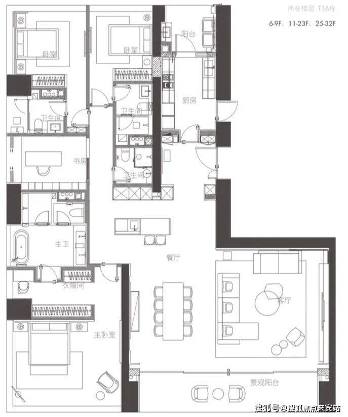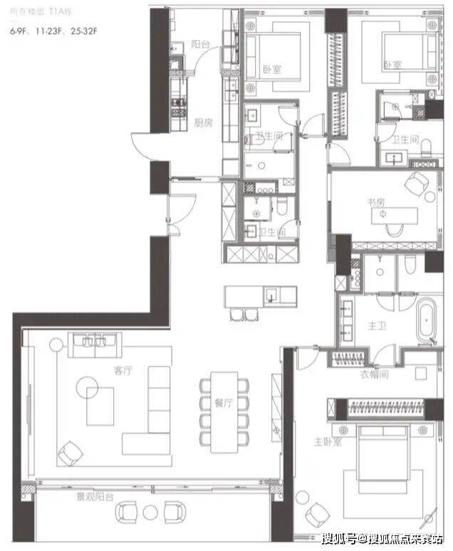 主力户型分析:项目主力产品为建面约300-800㎡的大平层。全系产品采用精装交付,由全球顶尖设计团队主理。其中,约300㎡户型为3-4房4卫,采用LDKB一体化设计,主卧套房尺度阔绰;约500㎡户型为4-5房5卫,拥有独立家政间、中西双厨及环绕式景观阳台;约800㎡户型为5-6房6卫的楼王单位,整层一户,配备私家电梯厅、空中泳池、全景天台及270度无边际湖景、城景、公园景观。