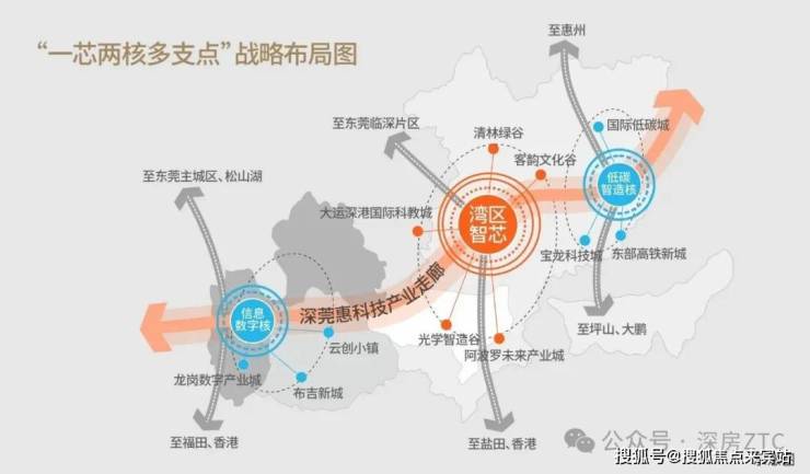•龙岗“一芯”“两核”“多支点”主体功能布局,大运新城作为“一芯”湾东智芯的代表,位居“东进战略”最前沿,也是港澳大湾区经济腹地、辐射粤东北的“桥头堡”打造深圳都市圈的“东核心”。