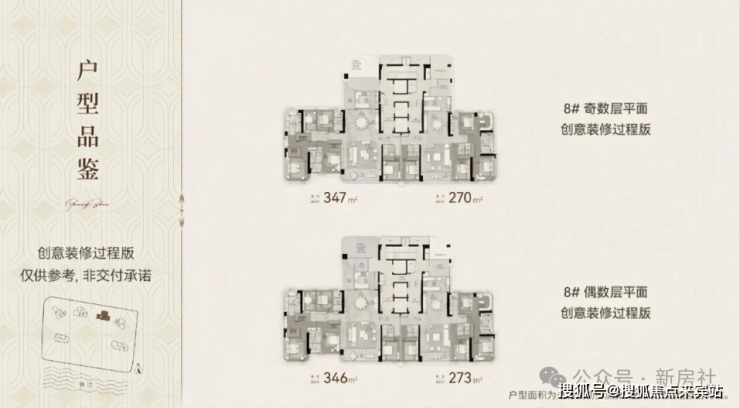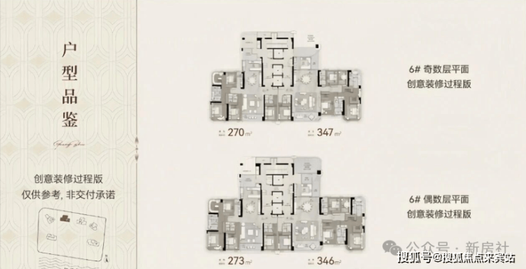 270/273㎡户型特点: 一层两户,3T2户独立梯厅互不扰; ·5.7*11.65m直厅宽敞大气; ·客厅、阳台、众数套房可正南望江及 琶洲会展; ·南北对流双阳台; ·工人梯独立动线,保障豪宅私密性; ·主卧270°景观转角飘窗; ·800mm飘窗可打; ·奇数层32㎡6.6m通高平台空间;