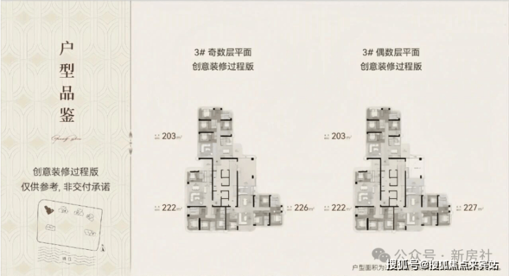 226/227㎡户型特点: 4T3户,均有独立电梯及门厅互不扰; ·8*8.4m大方厅,宽敞大气; ·超款客厅落地景观面,客厅、阳台、众数套房可望 江望琶洲总部及广州塔,景观优势(无主阳台); ·有独立工人房但无赠送平台; ·主卧270°景观转角飘窗,800mm飘窗可打;