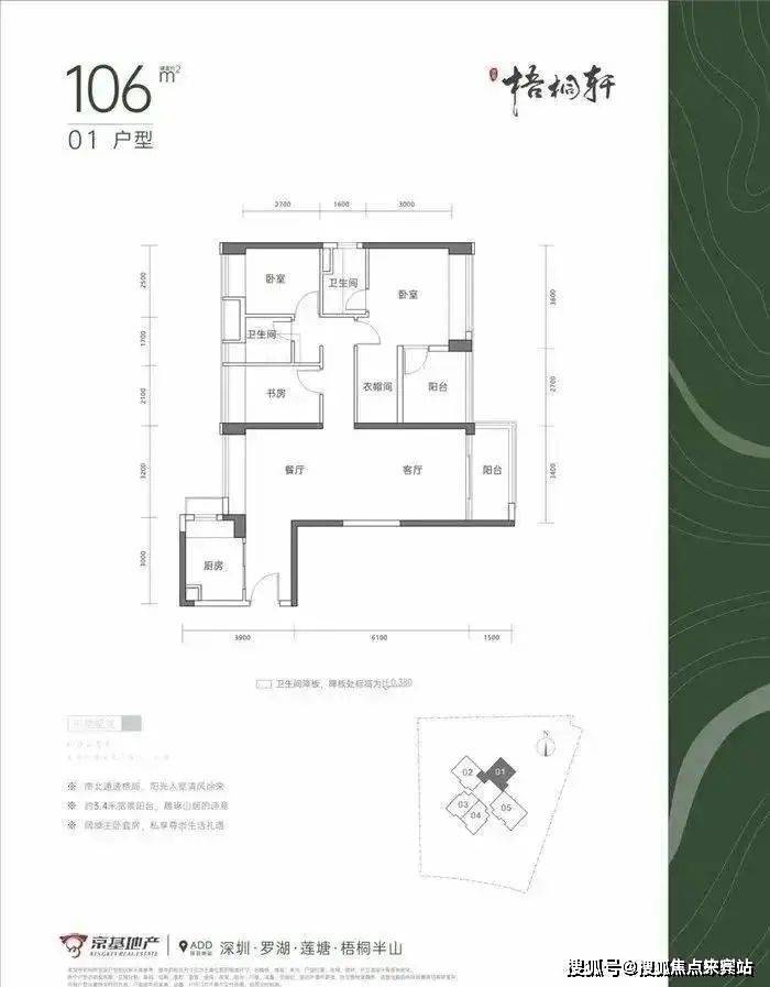 01户型106㎡的4房2厅2卫,竖厅南北通透格局,客厅3.4米开间,客厅阳台主朝东南朝向