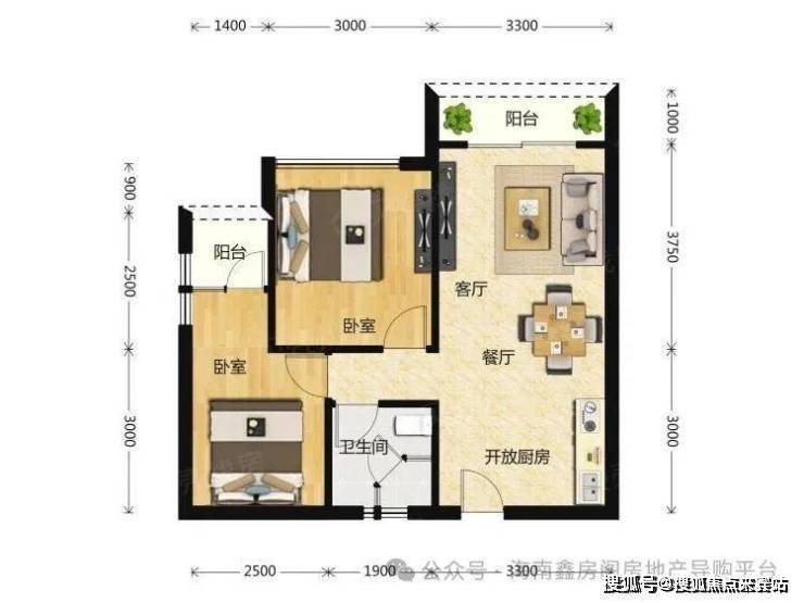 B户型两房一厅一卫: 50㎡送14㎡ 实得64㎡。
