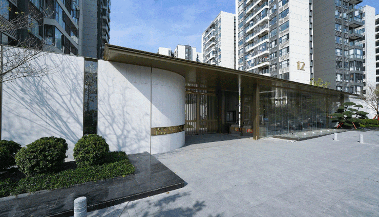 进入东大门的那一刻,白色石材与金属的搭配很有格调和质感,旁边挺拔的迎客松和涌动的喷泉,也增添了一丝归家仪式感。