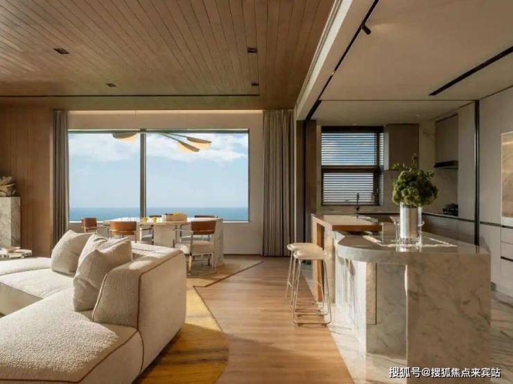 整个餐客厅以“不规则”、“自由”的开放式风格,呼应海岛的无拘无束,并点缀温润木饰面、亚麻布艺等海岛特色,为旅居者营造随心随性的居住体验。
