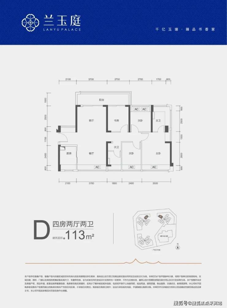 113㎡的4房2厅2卫,D户型,设计的是竖厅南北通透格局,客厅开间3.7米,4个卧室分别做到了3.5米/2.7米/2.7米/2.4米的宽度,客厅连接次卧出6.4米长的大阳台,U型厨房,公卫三段式分离,得房率约79%(不含赠送),阳台主朝西北或东北向。