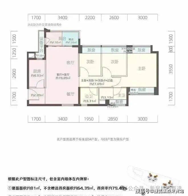 1㎡的3房2厅2卫,设计的是竖厅南北通透格局,客厅3.4米开间,3个卧室分别是3米/2.6米/2.2米的宽度,L型厨房,得房率:94.35%(包含赠送),阳台西北或东北朝向。