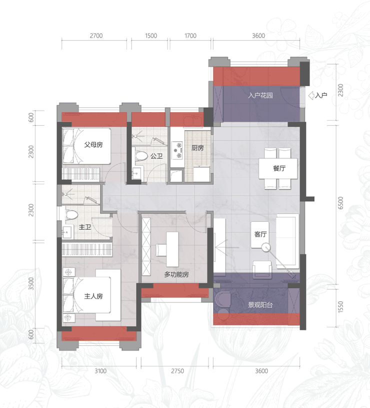 01/02户型103-107平三房两厅两卫,则采用南北通透的阔景阳台布局,采光和观景面积堪称巨幕,卧室配有观景飘窗,将社区园林与黄杨山美景一览无余。